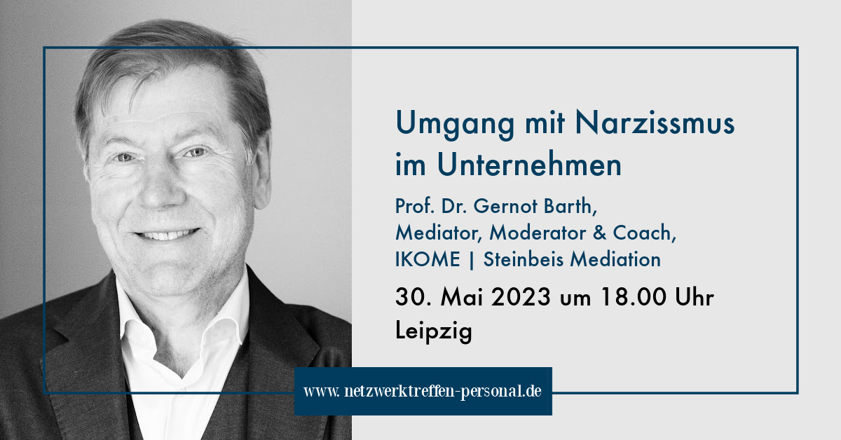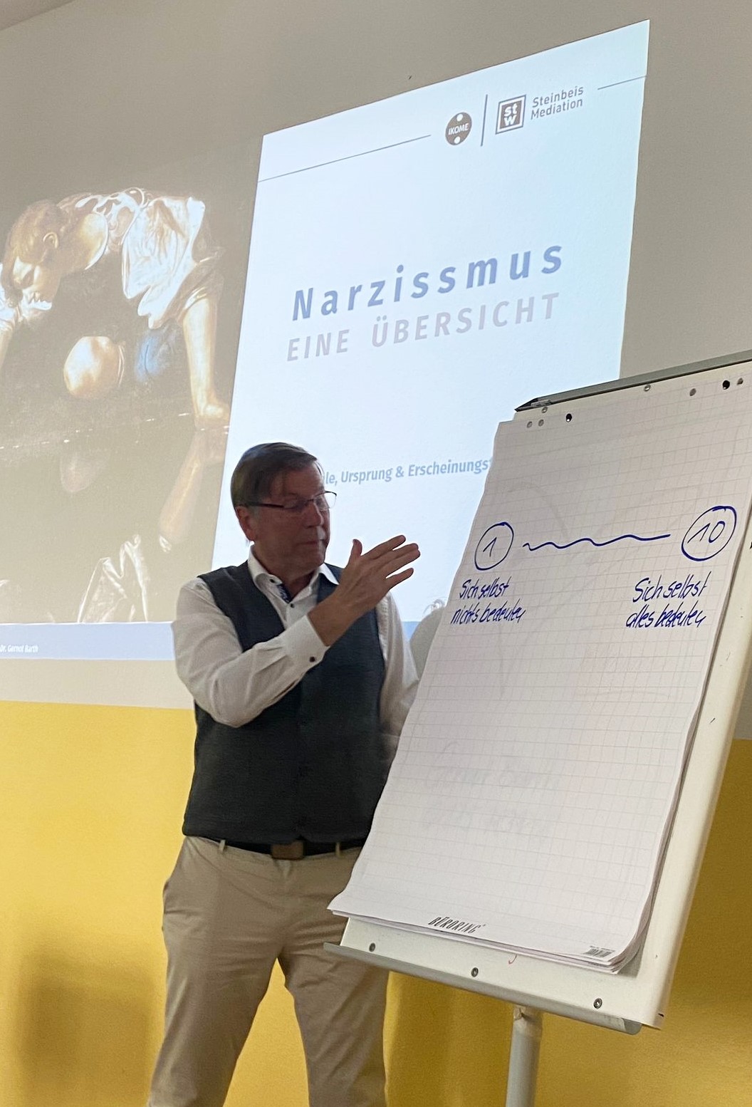 Wie man mit Narzissmus im Unternehmen umgeht, haben wir auf unserem Treffen am 30. Mai diskutiert. Professor Dr. Gernot Barth, Moderator, Mediator und Coach von IKOME / Steinbeis Mediation, stellte seine Erfahrungen und Erkenntnisse aus seiner Beratungspraxis vor und gab dazu Handlungsempfehlungen. (Download Präsentation siehe unten.) Stark diskutiert wurden dabei seine Thesen zum Narzissmus in den verschiedenen Generationen.