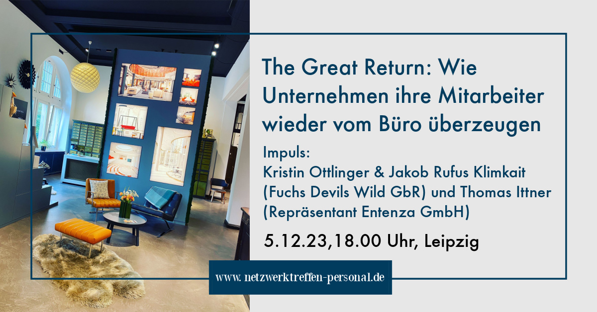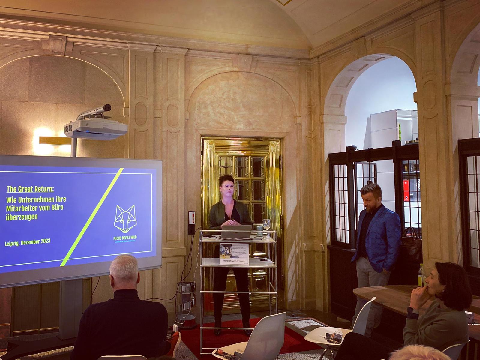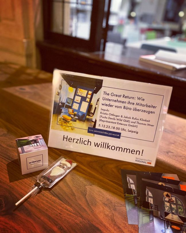Unter der Überschrift “The Great Return: Wie Unternehmen ihre Mitarbeiter wieder vom Büro überzeugen“ legten Kristin Ottlinger und Jakob Rufus Klimkait vom Unternehmen Fuchs Devils Wild gemeinsam mit Thomas Ittner, Repräsentant der Entenza GmbH, am 5.12.2023 den Grundstein für die angeregte Diskussion.