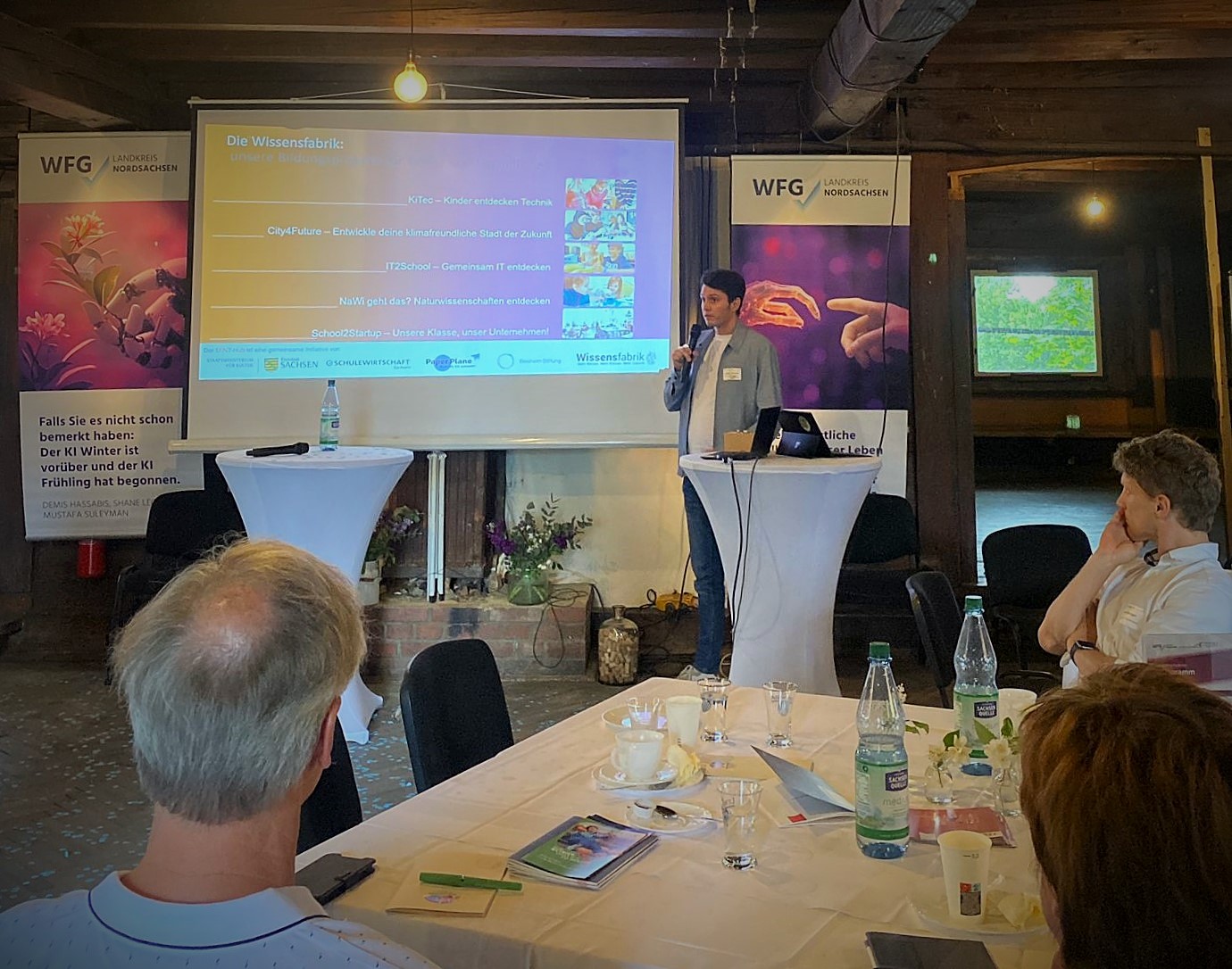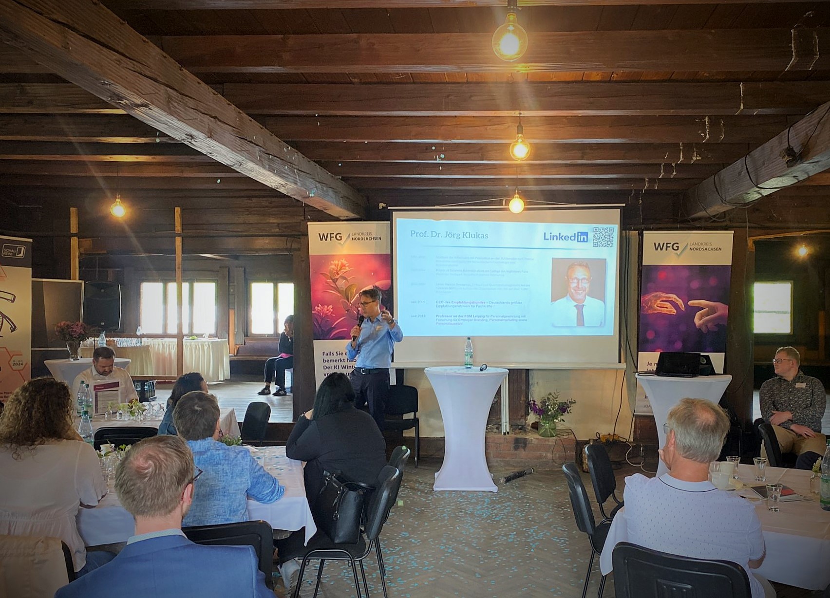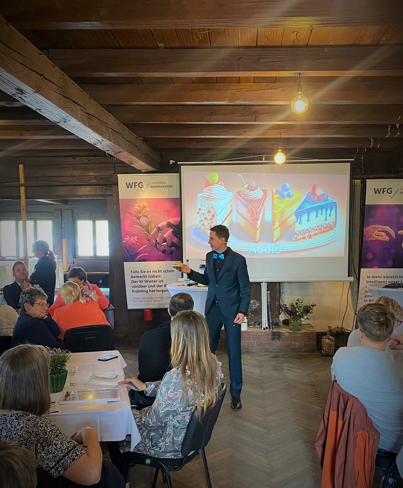 Richtung Zukunft wies auch der Impulsvortrag von Florian Arndt, Regisseur und Geschäftsführer bei der Sons of Motion Pictures GmbH – und einer der gefragtesten Speaker zum Thema Künstliche Intelligenz. 2014 machte Florian Arndt seine Passion zur Berufung und gründete die Filmagentur Sons Of Motion Pictures GmbH in Leipzig & Coburg, die weltweit Werbe-, Dokumentar- und Animationsfilme produziert. Florian Arndt hat mittlerweile sein Wissen aus der Unternehmenspraxis zu Kreativität, Führung, Teamführung, TikTok und Gen Z in mehr als 300 Key-Notes geteilt. Ein Thema, das ihn derzeit natürlich ganz besonders umtreibt, ist die Künstliche Intelligenz – und wie wir sie im Arbeitsalltag nutzen können. Dazu hat er sich ein so breites Wissen angeeignet, daß er von der Presse bereits den Titel „KI-Papst“ verliehen bekommen hat. In seinem sehr unterhaltsamen Vortrag auf dem Fachtag Fachkräfte wurde er diesem Ruf gerecht und stellte praxisnah unterschiedlichste KI-Anwendungen vor, die jeder in seinen Arbeitsalltag integrieren kann, oder, wie er es sagt: „20 KI´s, die Deinen Beruf revolutionieren“.