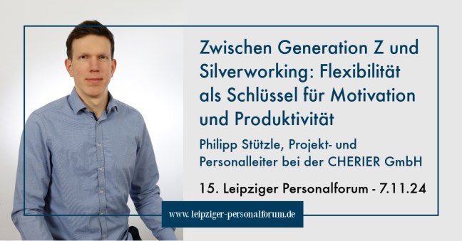 Auch in diesem Jahr sprachen auf dem Leipziger Personalforum am Vormittag Unternehmen aus der Region in Best-Practice-Vorträgen zu aktuellen Personalfragen und zeigten Lösungen auf. Einer der Referenten wart Philipp Stützle, Projekt- und Personalleiter bei der CHERIER GmbH. In seinem Vortrag auf dem 15. Leipziger Personalforum stellte Philipp Stützle einige Best Practice Beispiele aus seinem Alltag als Personalleiter vor und präsentierte praxiserprobte Lösungen, wie Unternehmen durch flexible Arbeitsmodelle sowohl die Motivation der Generation Z als auch die Produktivität von älteren Fachkräften steigern können.