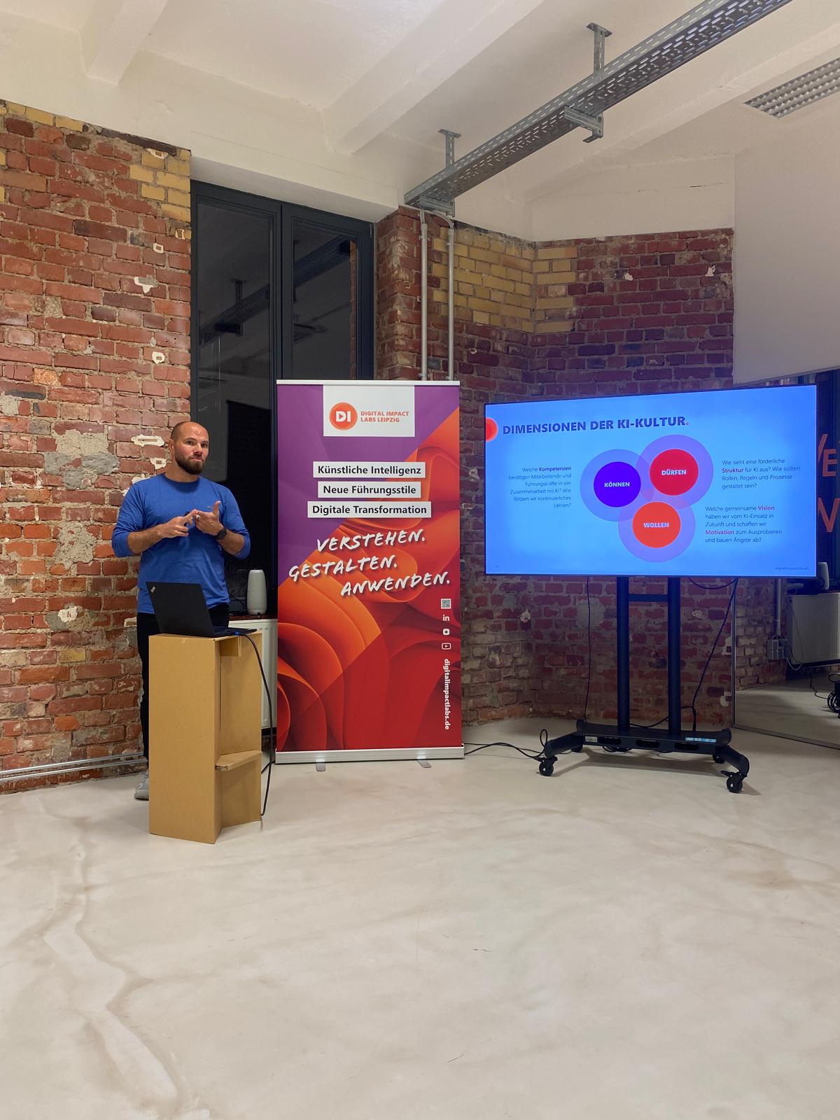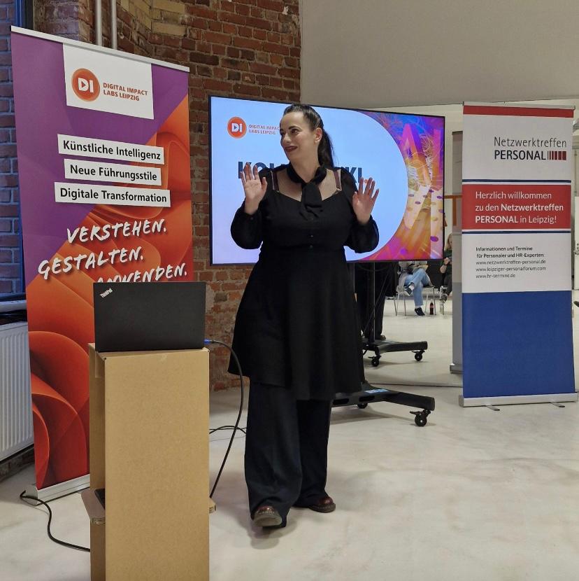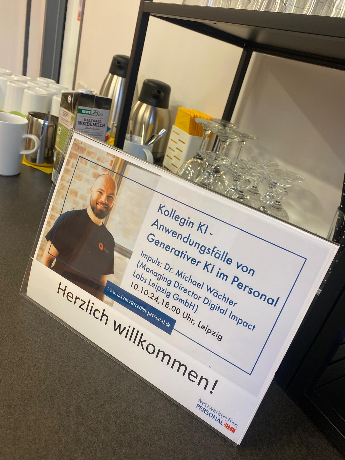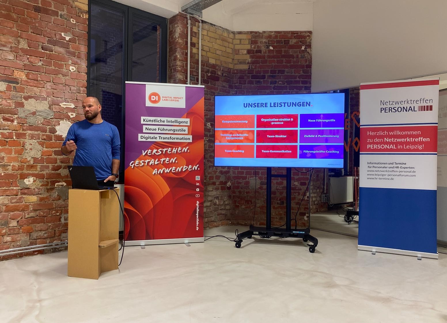 Am 10. Oktober trafen wir uns in Leipzig-Plagwitz in den Räumen der Digital Impact Labs Leipzig GmbH , um über das Thema „Kollegin KI – Anwendungsfälle von Generativer KI im Personal“ zu diskutieren. Nach einer Einführung in das Thema durch Dr. Michael Wächter, Managing Director der Digital Impact Labs Leipzig, tauschten wir uns in kleiner Runde darüber aus, was die KI (schon) kann und was (noch) nicht und welche Einsatzgebiete wir im Personalbereich sehen.