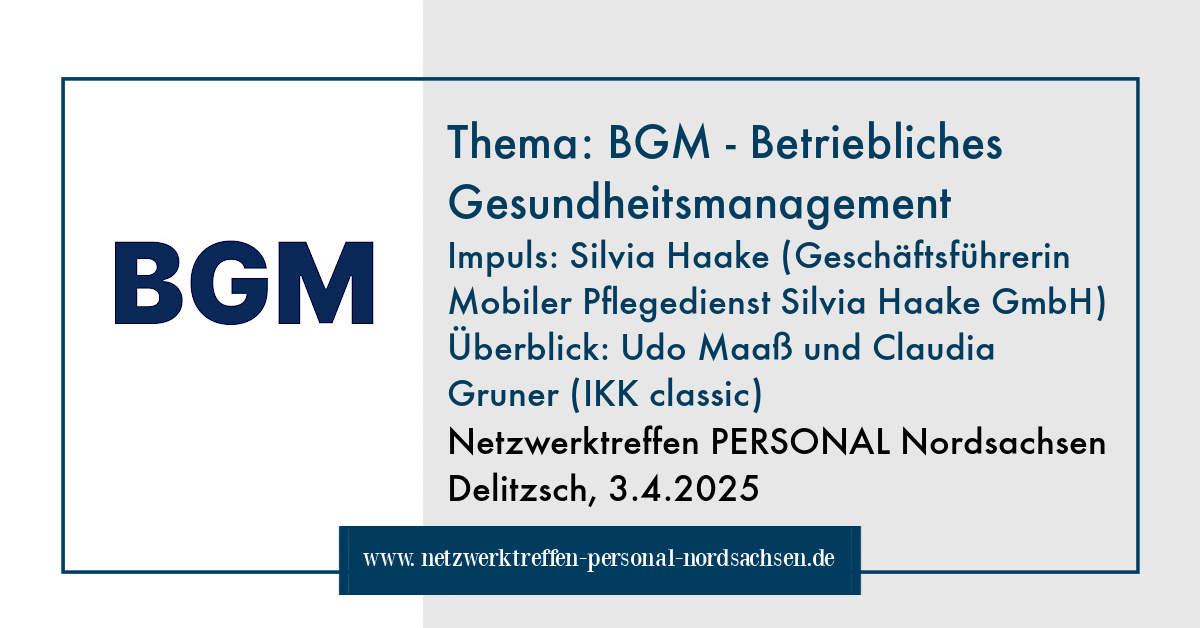 Am 3. April 2025 bringt die 3. Veranstaltung der Netzwerktreffen PERSONAL Nordsachsen wieder Personaler und HR-Experten aus der Region zum Netzwerken und fachlichen Austausch zusammen. Auch diesmal greifen wir eine thematische Anregung der Teilnehmer und Teilnehmerinnen auf, die am zweiten Treffen teilgenommen haben (Rückblick 2. Treffen), und tauschen uns aus zum Thema „BGM – Betriebliches Gesundheitsmanagement„. Das Netzwerktreffen findet um 18 Uhr in Delitzsch bei „Mobiler Pflegedienst Silvia Haake GmbH“ statt.