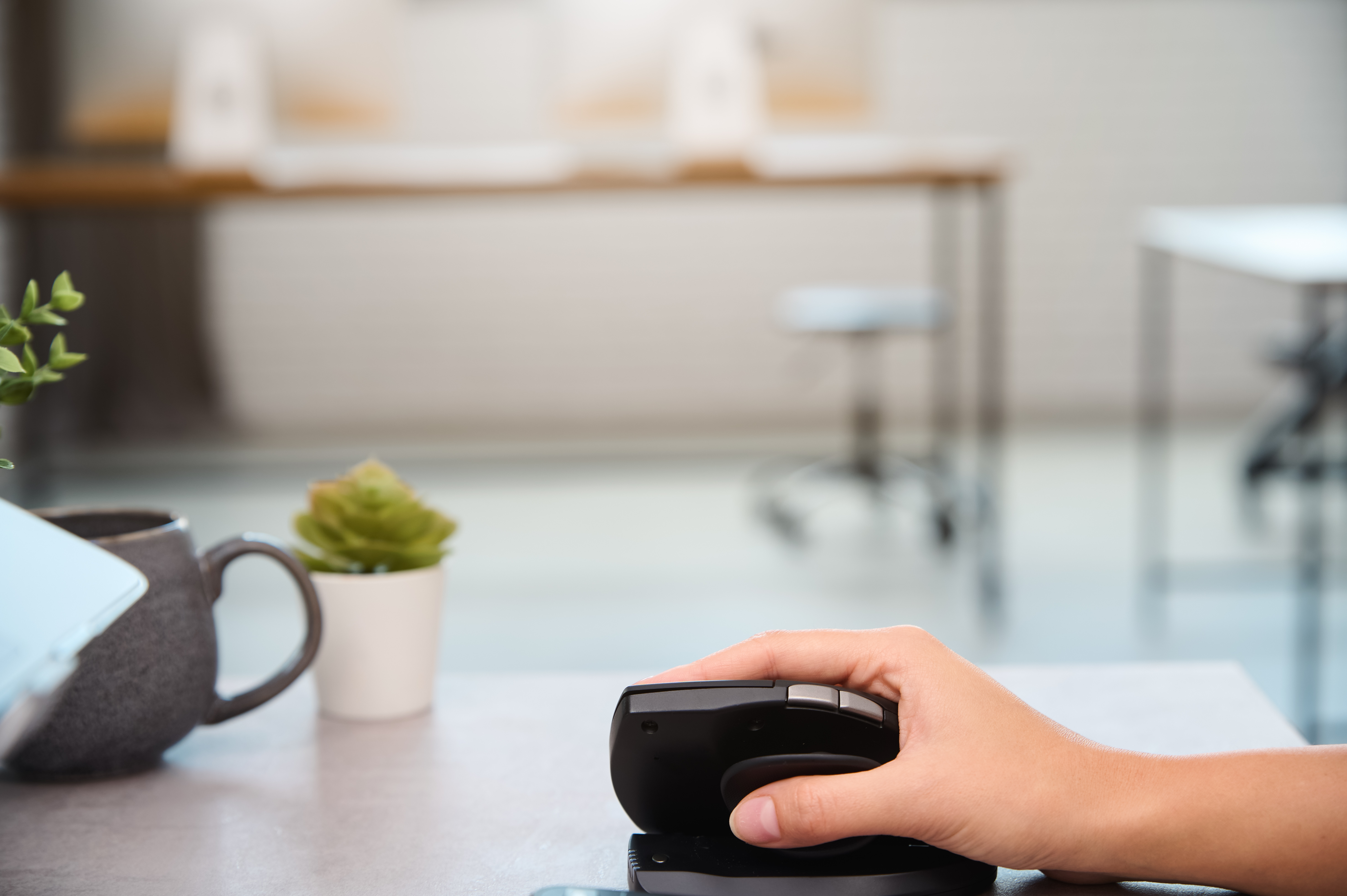 Dagmar: Wir gehen dabei schon relativ weit: Alles rund um die klassische (ergonomische) Arbeitsplatzausstattung, sei es von der Fußwippe über den höhenverstellbaren Tisch oder Stuhl bis zum Bildschirmfilter, wenn jemand eine besondere Augenerkrankung hat, oder eine besondere Beleuchtung oder eine akustische Optimierung. Diese Hilfsmittel fallen in unsere Zuständigkeit, also alles, was Ergonomie am Arbeitsplatz ist. Dabei beschäftigen wir uns sowohl mit dem Büroarbeitsplatz als auch mit dem Industriearbeitsplatz, denn auch beim Industrie-Arbeitsplatz kann man viel tun: Mit einer Entlastungsmatte, einer Stehhilfe, oder zum Beispiel mit einem Scherenhubtisch, wenn jemand gar nicht mehr tragen kann, aber trotzdem im Produktionsprozess eingesetzt ist und da auch bleiben möchte. Das gehört alles dazu. Wir kooperieren teilweise mit Sanitätshäusern und auch mit anderen Herstellern, die manchmal über die klassische Bürobranche hinausgehen. Wir können da sehr, sehr viel an Beratung und Leistung abdecken.