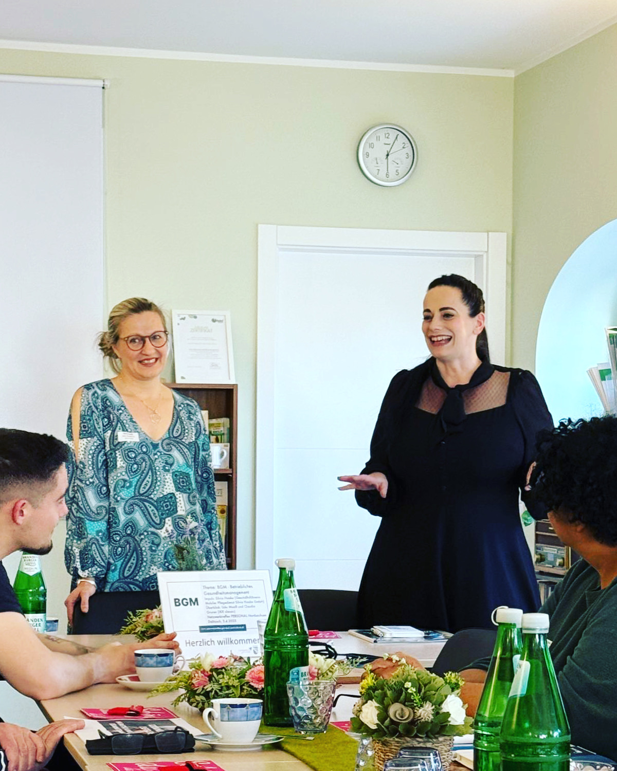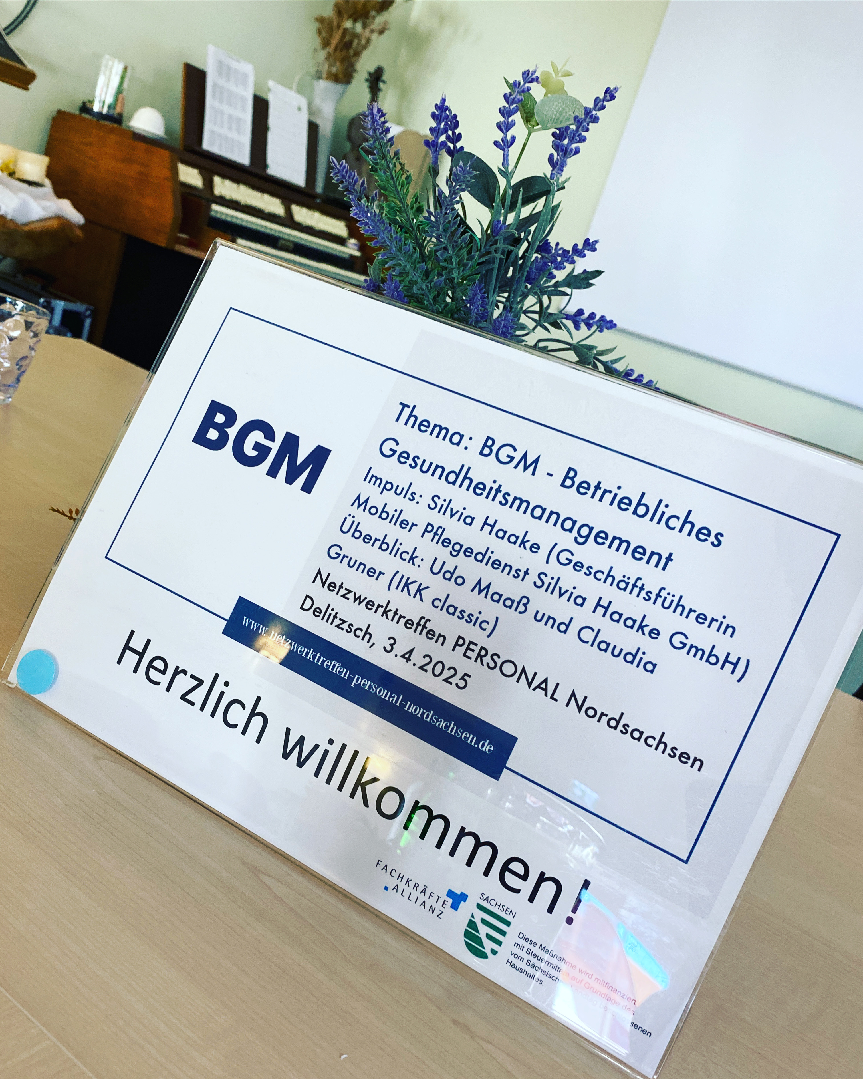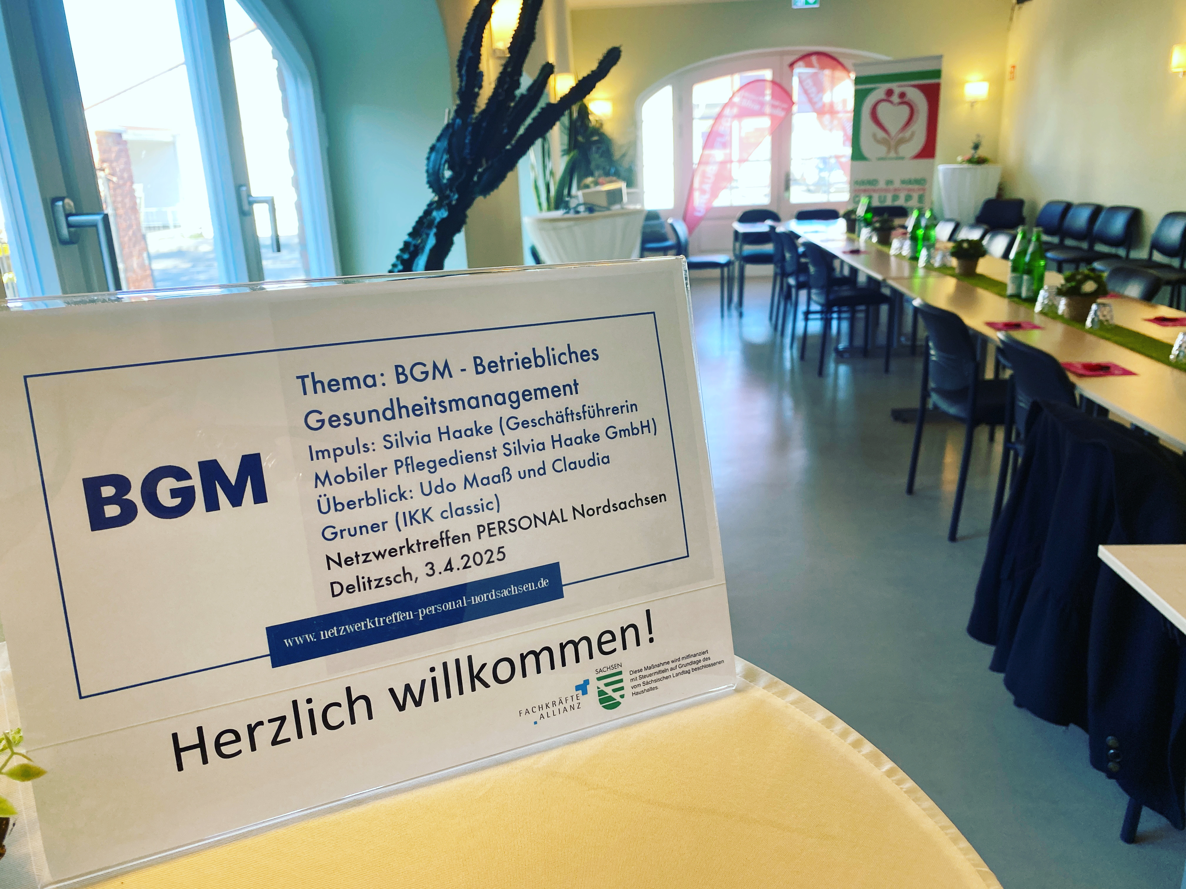 Am 3. April 2025 trafen sich Personaler und HR-Experten aus dem Landkreis Nordsachsen zur 3. Veranstaltung der Netzwerktreffen PERSONAL Nordsachsen. Diesmal stand in Delitzsch das Thema „BGM – Betriebliches Gesundheitsmanagement“ auf der Agenda. Zum PRAXIS-Einstieg gab Silvia Haake einen Überblick, wie das betriebliche Gesundheitsmanagement in ihrem Unternehmen umgesetzt und gelebt wird. Als Geschäftsführerin der Mobiler Pflegedienst Silvia Haake GmbH berichtete sie, welche Maßnahmen bei ihr im Vordergrund stehen, um die psychische und physische Gesundheit ihrer Mitarbeiter und Mitarbeiterinnen zu stärken. Besonders beeindruckte dabei die große Nähe, die sie zu ihrem Team hat. Vor fast 30 Jahren gründete Silvia Haake ihren Mobilen Pflegedienst., heute führt sie 70 Mitarbeiter an und kümmert sich in Delitzsch und Torgau um Menschen, die es nicht mehr selbst tun können. „Unsere Arbeit ist ein grosses Stück Berufung“ ist sie überzeugt. „Mitarbeiter-Fürsorge“ ist ihr dabei ein wichtiges Anliegen.