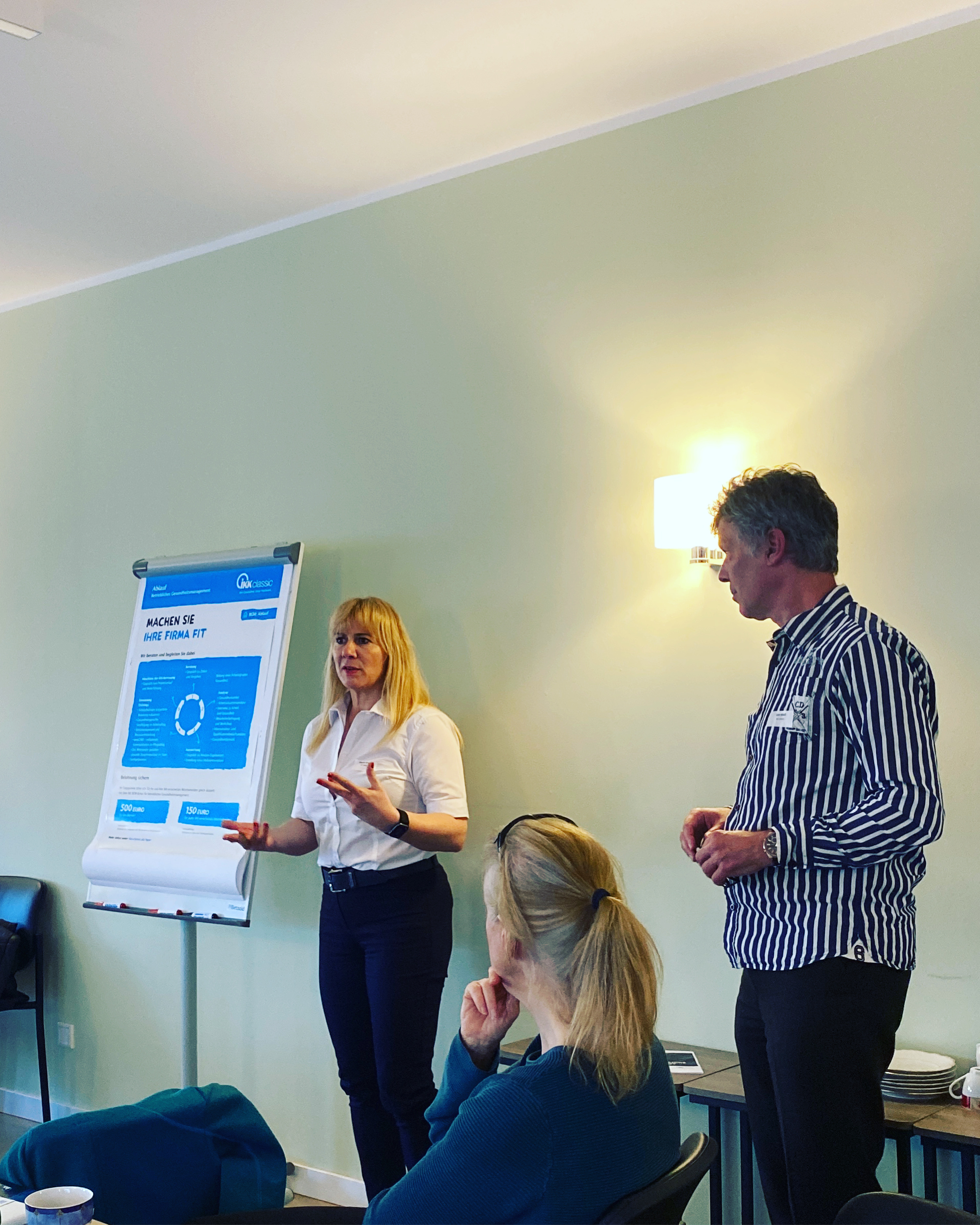 Ziel des Betrieblichen Gesundheitsmanagement (BGM) ist es, Belastungen der Mitarbeiter und Mitarbeiterinnen zu reduzieren und deren persönliche Ressourcen zu fördern. Mittel- bis langfristig wird die Mitarbeiterbindung kontinuierlich gestärkt und die Arbeitsfähigkeit der Fachkräfte bleibt erhalten. Ansprechpartner für BGM sind daher immer auch die Krankenkassen, die verschiedene Programme anbieten, um die Unternehmen zu unterstützen. Zum Netzwerktreffen erläuterte Udo Maaß, Gesundheitsmanager von der IKK classic, wie die Implementierung des BGM stattfinden kann und welche Inhalte dazu gehören. Gemeinsam mit seiner Kollegin Claudia Gruner (Kundenberaterin mit besonderen Aufgaben der IKK classic) beantwortete er noch Fragen rund um dieses Thema, bevor die Diskussion und den Erfahrungsaustausch in lockerer Runde bei einem Imbiss fortgesetzt wurde.