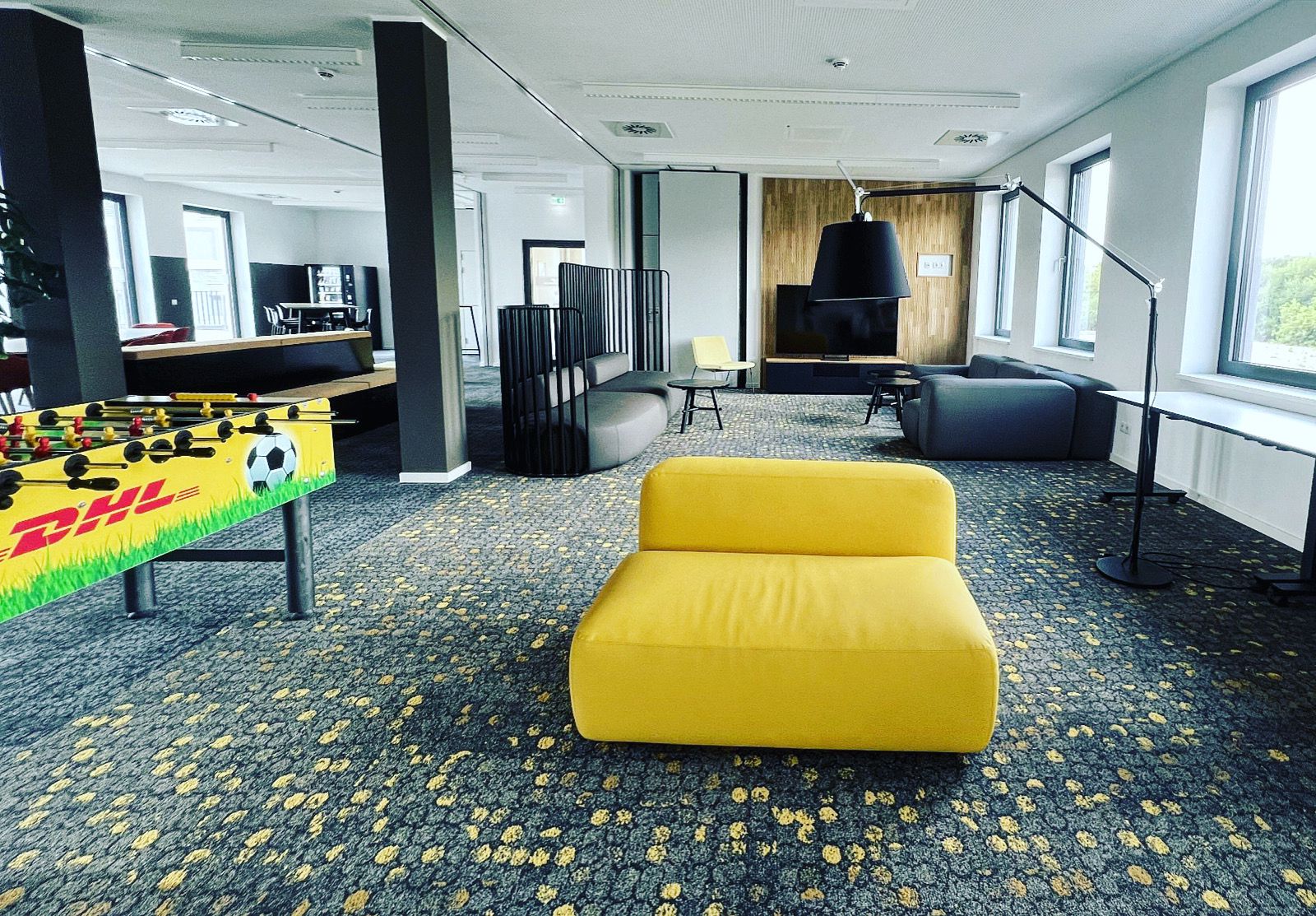 Wir treffen uns „zwischen Tischtennisplatte und Tischkicker“ am LEJ Campus in Schkeuditz, der 2023 als moderner Büro- und Arbeitskomplex für das DHL Drehkreuz Leipzig eröffnet wurde.