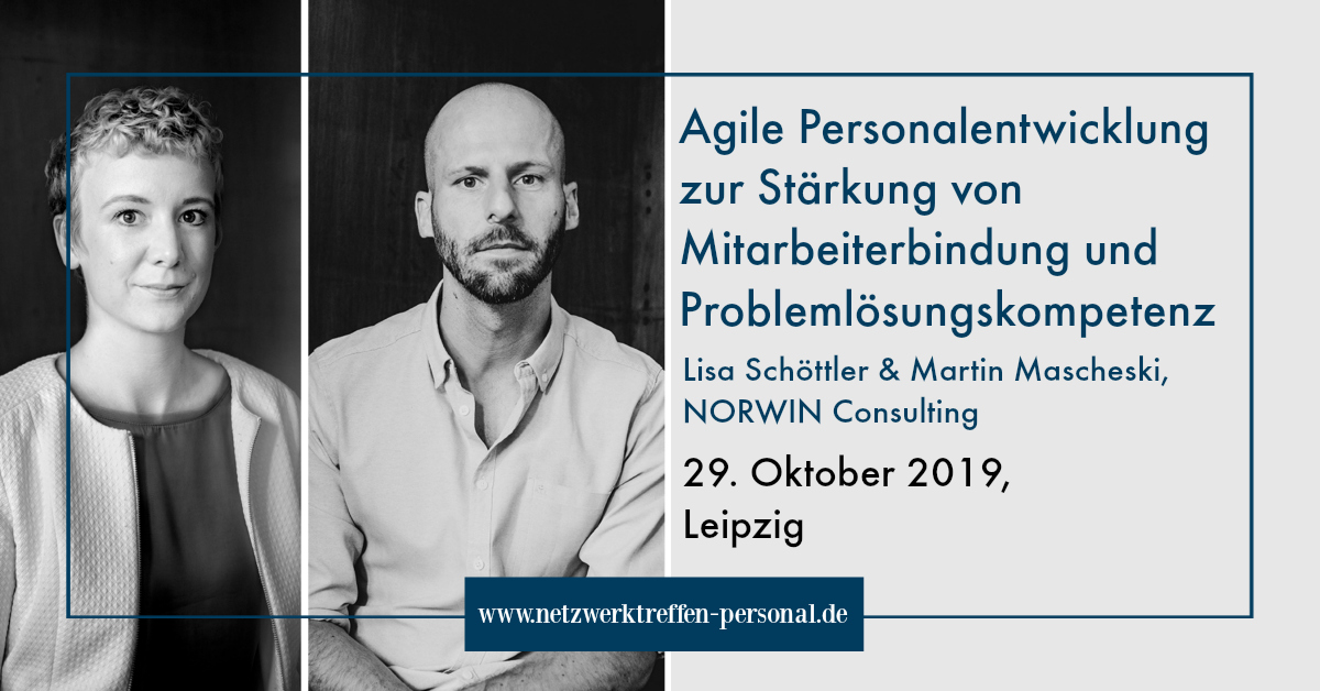 Im Oktober haben wir uns in einem Treffen mit Workshop-Charakter darüber ausgetauscht, wie agile Personalentwicklung die Mitarbeiterbindung und Problemlösungskompetenz stärken kann. Lisa Schöttler und Martin Mascheski von NORWIN Consulting werden praxisnah einen Einblick in Methoden aus dem systemischen Coaching und in agile Arbeitsweisen geben, die Sie als Personaler in Ihrem Arbeitsalltag einsetzen können. Unsere Experten zum Thema „Agile Personalentwicklung zur Stärkung von Mitarbeiterbindung und Problemlösungskompetenz„: Lisa Schöttler und Martin Mascheski von NORWIN Consulting