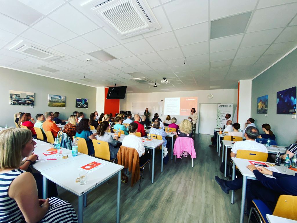 Unter der Überschrift „unternehmensWert:Mensch – Fördermöglichkeit für nachhaltige Personalarbeit“ stellte Frau Dr. Gärtner vom Arbeit und Leben Sachsen e.V. die Förderprogramme unternehmensWert:Mensch und unternehmensWert:Mensch plus vor, die speziell für KMUs gedacht sind.